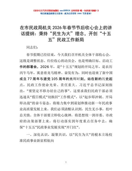 / 在市民政局机关2026年春节节后收心会上的讲话提纲:秉持“民生为大”理念,开创“十五五”民政工作新局