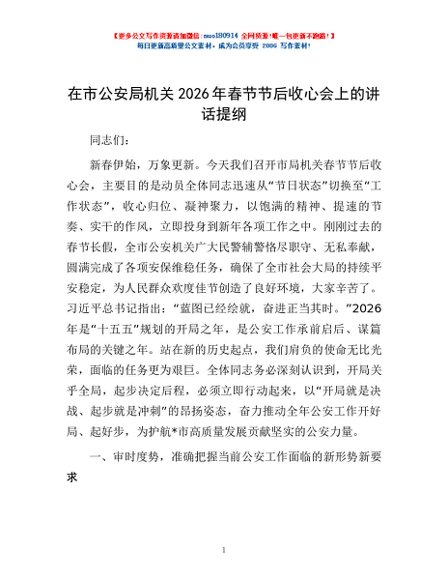 / 在市公安局机关2026年春节节后收心会上的讲话提纲
