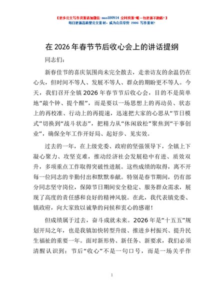/ 在2026年春节节后收心会上的讲话提纲