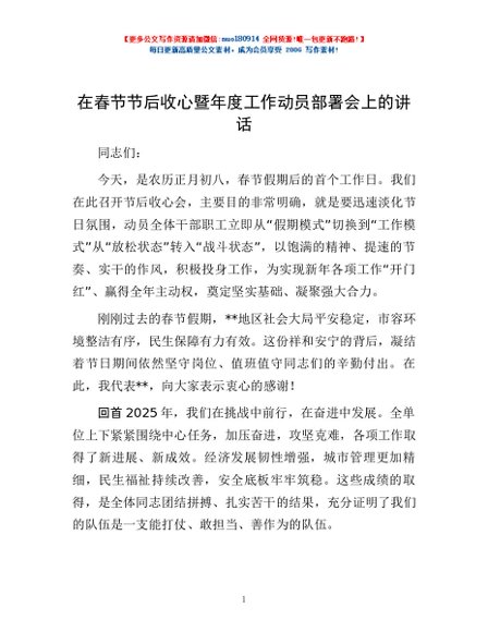 / 在春节节后收心暨年度工作动员部署会上的讲话