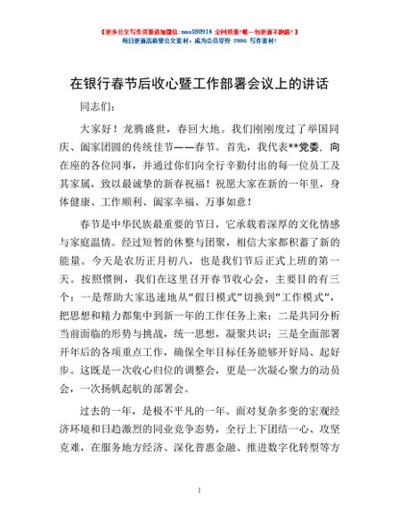 / 在银行春节后收心暨工作部署会议上的讲话