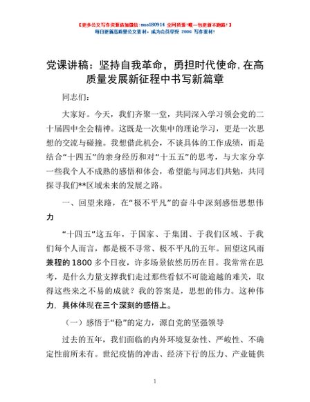 / 党课讲稿:坚持自我革命,勇担时代使命,在高质量发展新征程中书写新篇章