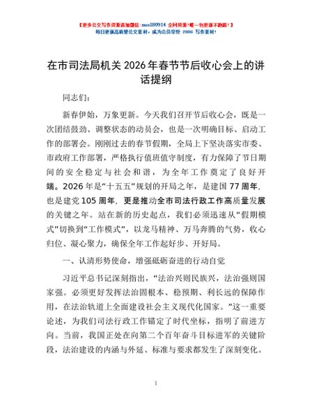 / 在市司法局机关2026年春节节后收心会上的讲话提纲