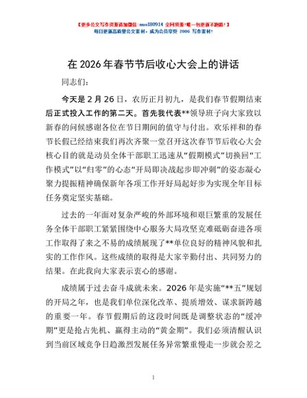 / 在2026年春节节后收心大会上的讲话