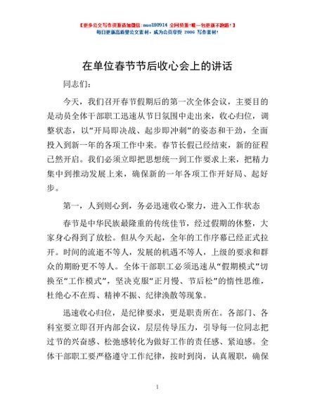 / 在单位春节节后收心会上的讲话
