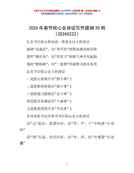 / 2026年春节收心会讲话写作提纲30例(20260222)