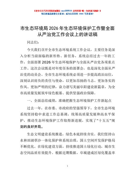 / 市生态环境局2026年生态环境保护工作暨全面从严治党工作会议上的讲话稿
