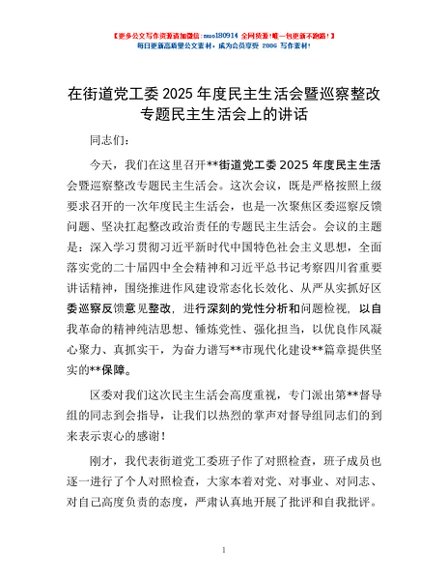 / 在街道党工委2025年度民主生活会暨巡察整改专题民主生活会上的讲话