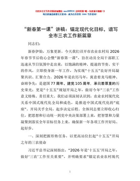 / “新春第一课”讲稿:锚定现代化目标,谱写全市三农工作新篇章