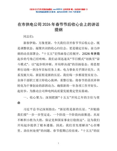 / 在市供电公司2026年春节节后收心会上的讲话提纲