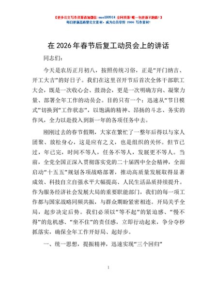 / 在2026年春节后复工动员会上的讲话