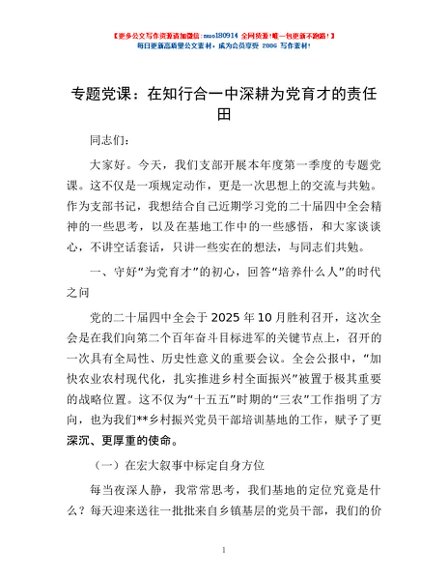 / 专题党课:在知行合一中深耕为党育才的责任田