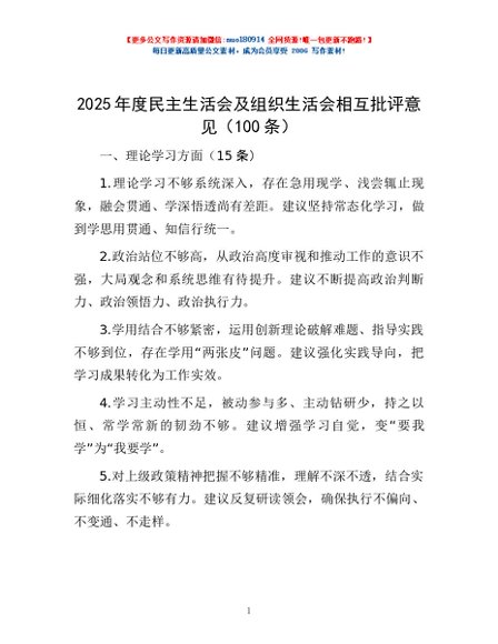 / 2025年度民主生活会及组织生活会相互批评意见(100条)