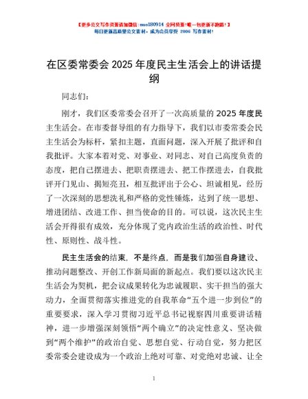 / 在区委常委会2025年度民主生活会上的讲话提纲
