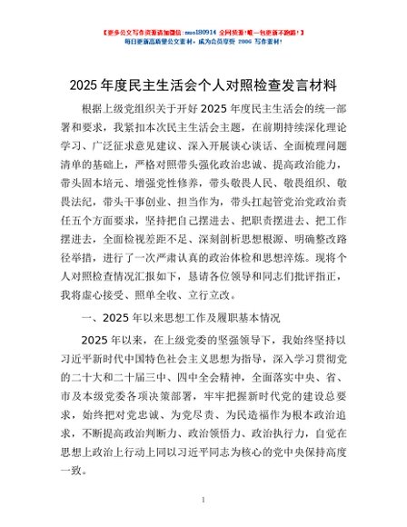 / 2025年度民主生活会个人对照检查发言材料