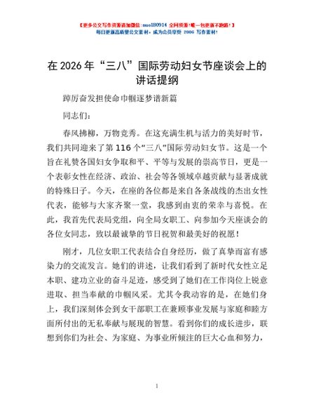 / 在2026年“三八”国际劳动妇女节座谈会上的讲话提纲