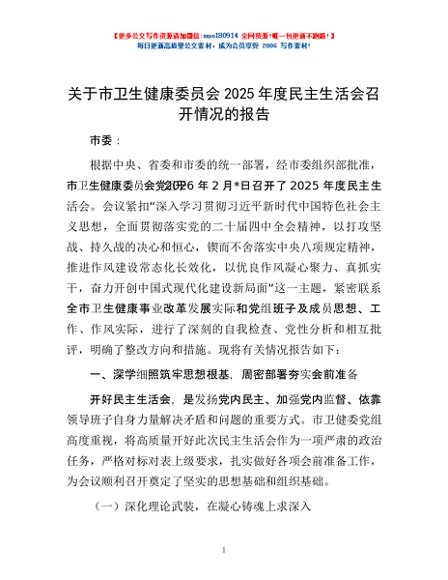 / 关于市卫生健康委员会2025年度民主生活会召开情况的报告