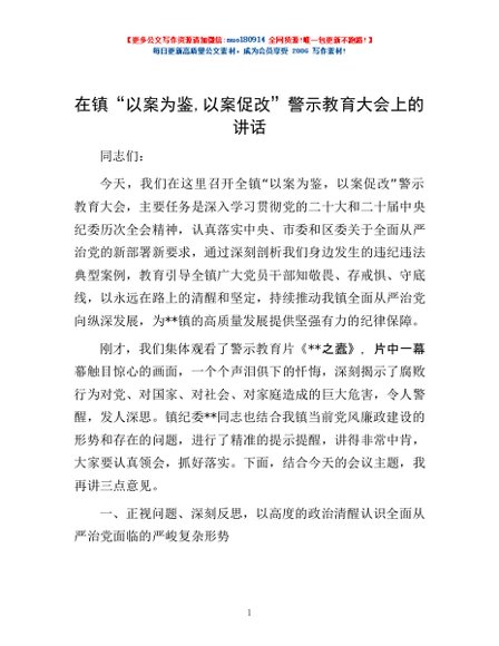 / 在镇“以案为鉴,以案促改”警示教育大会上的讲话