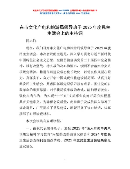 / 在市文化广电和旅游局领导班子2025年度民主生活会上的主持词