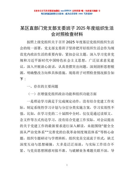 / 某区直部门党支部支委班子2025年度组织生活会对照检查材料