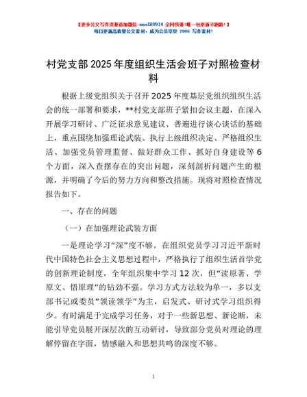 / 村党支部2025年度组织生活会班子对照检查材料