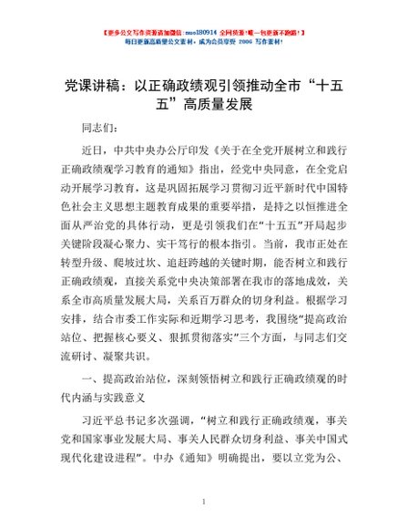 / 党课讲稿:以正确政绩观引领推动全市“十五五”高质量发展