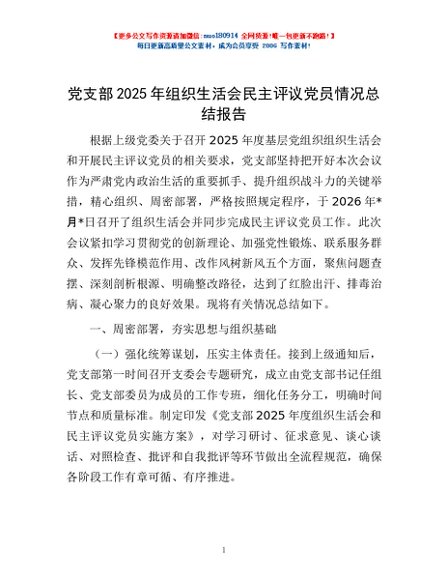 / 党支部2025年组织生活会民主评议党员情况总结报告