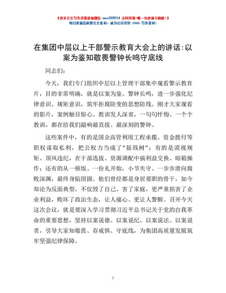 / 在集团中层以上干部警示教育大会上的讲话:以案为鉴知敬畏 警钟长鸣守底线