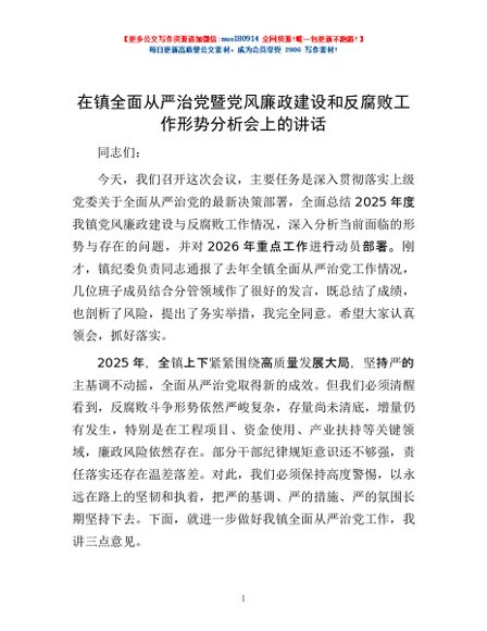 / 在镇全面从严治党暨党风廉政建设和反腐败工作形势分析会上的讲话