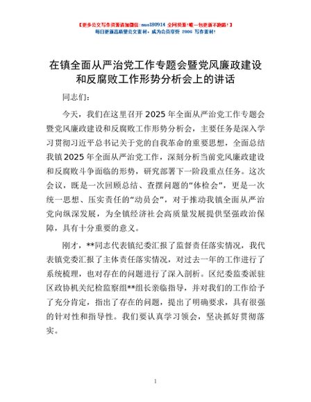 / 在镇全面从严治党工作专题会暨党风廉政建设和反腐败工作形势分析会上的讲话