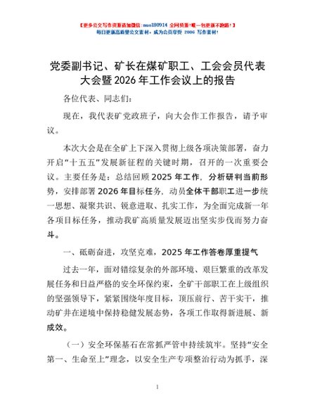 / 党委副书记、矿长在煤矿职工、工会会员代表大会暨2026年工作会议上的报告