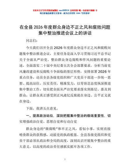 / 在全县2026年度群众身边不正之风和腐败问题集中整治推进会议上的讲话