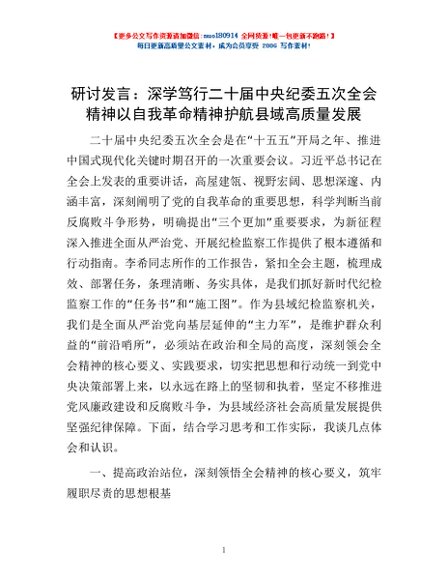 / 研讨发言:深学笃行二十届中央纪委五次全会精神以自我革命精神护航县域高质量发展