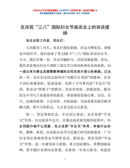 / 在庆祝“三八”国际妇女节座谈会上的讲话提纲