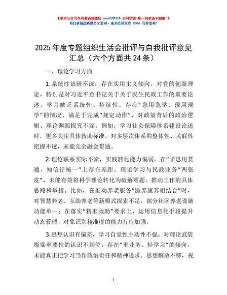 / 2025年度专题组织生活会批评与自我批评意见汇总(六个方面共24条)