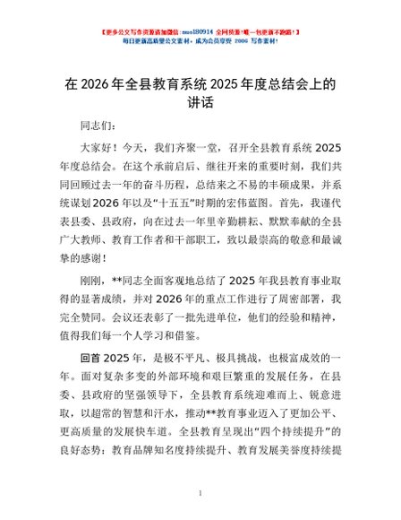 / 在2026年全县教育系统2025年度总结会上的讲话