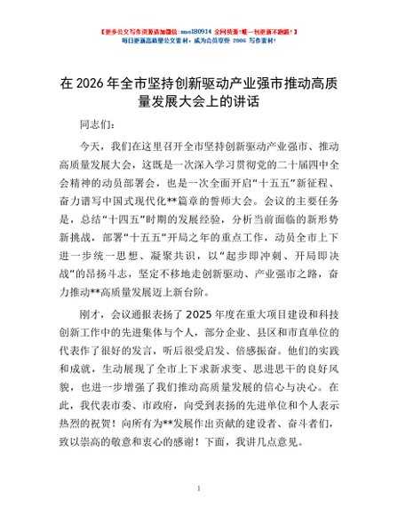 / 在2026年全市坚持创新驱动产业强市推动高质量发展大会上的讲话