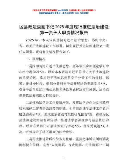 / 区县政法委副书记2025年度履行推进法治建设第一责任人职责情况报告
