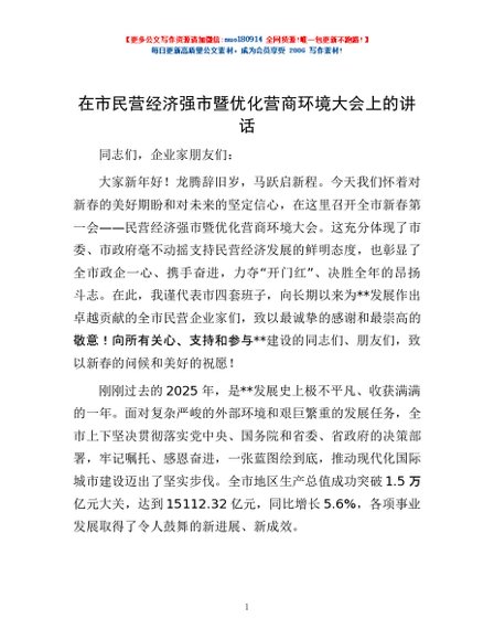 / 在市民营经济强市暨优化营商环境大会上的讲话