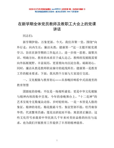 / 在新学期全体党员教师及教职工大会上的党课讲话