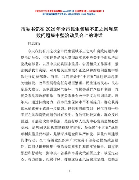 / 市委书记在2026年全市民生领域不正之风和腐败问题集中整治动员会上的讲话