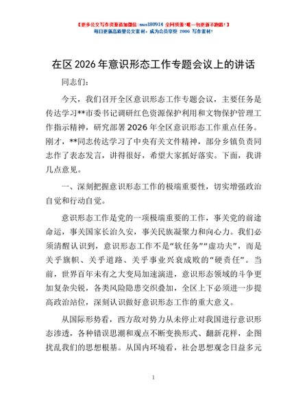 / 在区2026年意识形态工作专题会议上的讲话