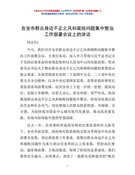 / 在全市群众身边不正之风和腐败问题集中整治工作部署会议上的讲话