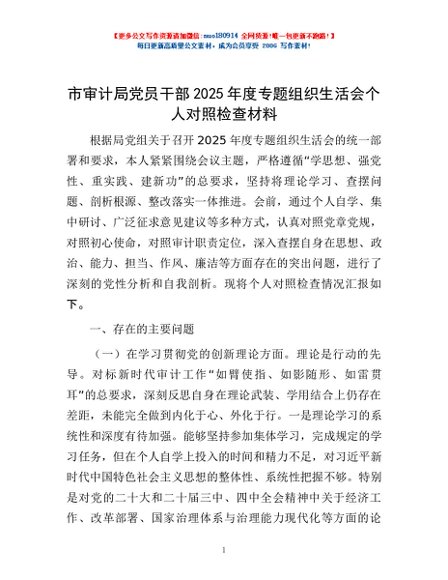 / 市审计局党员干部2025年度专题组织生活会个人对照检查材料