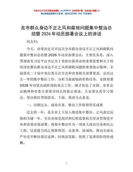/ 在市群众身边不正之风和腐败问题集中整治总结暨2026年动员部署会议上的讲话