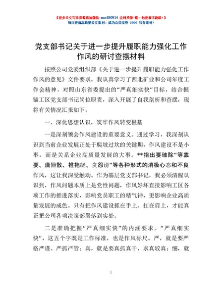 / 党支部书记关于进一步提升履职能力强化工作作风的研讨查摆材料