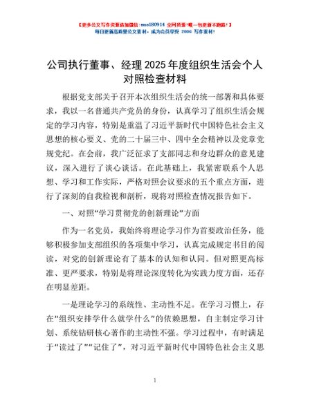 / 公司执行董事、经理2025年度组织生活会个人对照检查材料