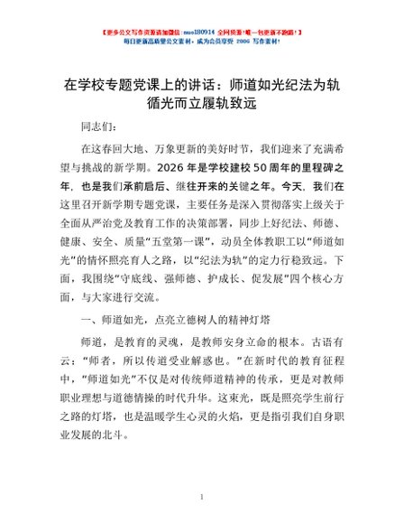 / 在学校专题党课上的讲话:师道如光 纪法为轨 循光而立 履轨致远