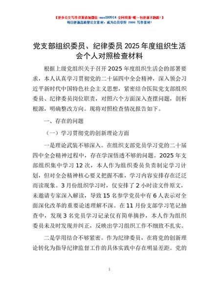 / 党支部组织委员、纪律委员2025年度组织生活会个人对照检查材料