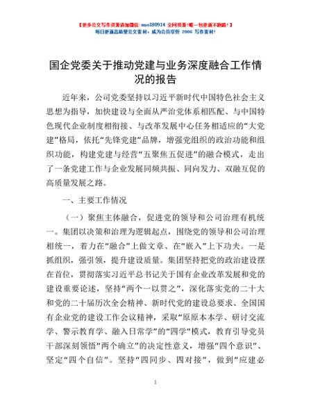 / 国企党委关于推动党建与业务深度融合工作情况的报告